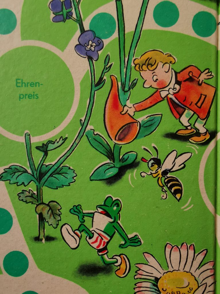 Ich habe es sehr viel mit meiner Oma und ihrer Schwester (also meiner Großtante) gespielt, die unendlich viel Geduld mit mir hatten, da ich schlecht verlieren konnte. Fasziniert haben mich die niedlichen Bilder auf dem Spielplan, eindrücklich im Gedächtnis blieb mir der Frosch, der sich einen Stachel der Distel eingetreten hat (rechter Spielrand). Und auch das Sammeln der einzelnen Blumen fand ich total klasse. Die legt man sich auf sein Strauß-Tableau, und wer zuerst das Tableau voll hat, hat gewonnen. Aber es mussten bei mir schon immer die richtigen Blumen sein, d.h. ich wollte immer ganz bestimmte Arten haben. Tja, und waren die schon bei einem anderen Spieler auf dem Strauß, dann wurde meine Laune nicht besser…