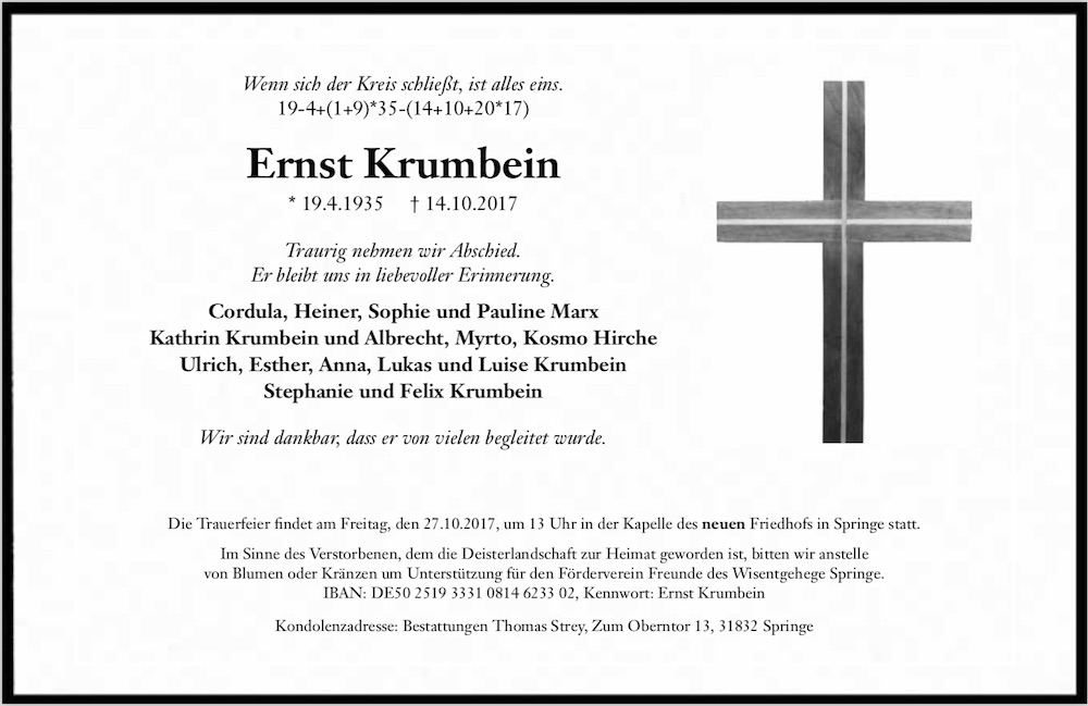 Ernst Krumbein ist am 14. Oktober 2017 verstorben.